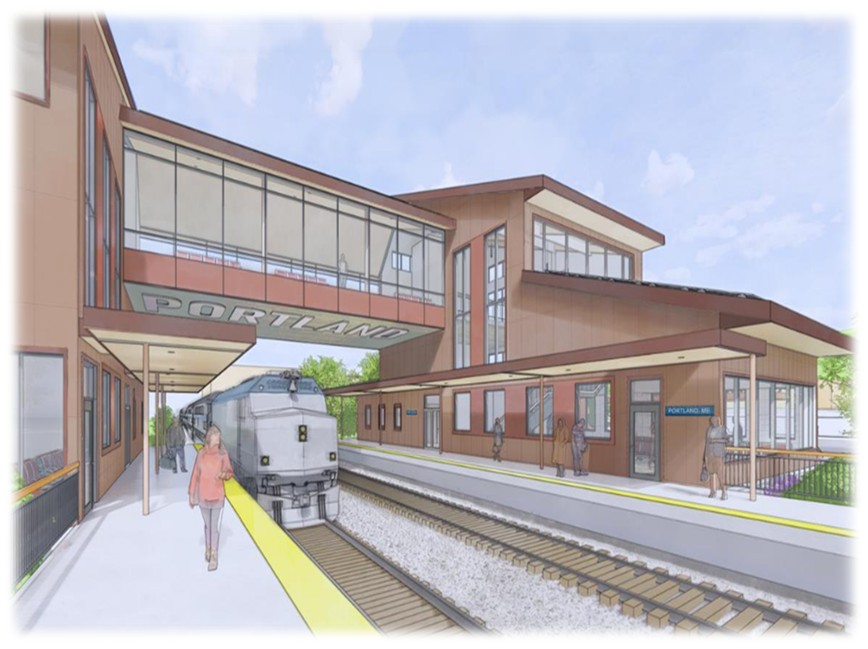 The 2023 Maine State Rail Plan (MSRP) passenger rail investment program includes relocating Portland Station, forecasting that the time savings and improved accessibility to employment centers would increase Downeaster ridership by 66,000 riders annually.