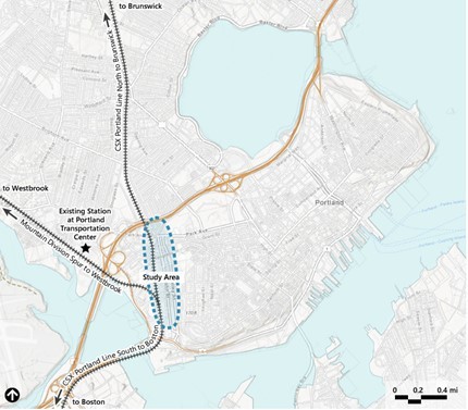 In 2019, MaineDOT, in cooperation with NNEPRA, Concord Coach Lines, the City of Portland, Greater Portland Metro and GPCOG conducted a study to evaluate the benefits and challenges associated with the current station location on Thompson’s Point, and opportunities for relocation on the mainline. The Executive Summary concluded that MaineDOT would support NNEPRA in evaluating a new station on the railroad mainline between Congress Street and the Veterans Memorial Bridge Overpass.