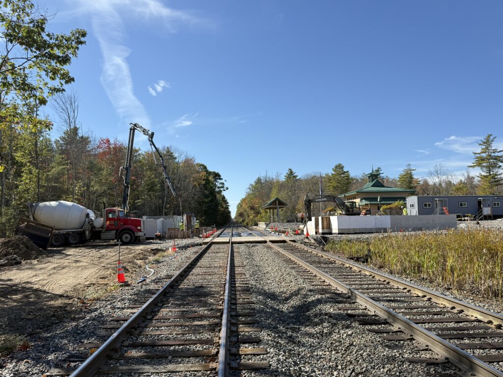 PLATFORM CONSTRUCTION: The second Project element, construction of a new platform at Wells Transportation Center, began March 3, 2025. One boarding platform currently exists adjacent to the Wells station building. That platform will be rebuilt, and a second platform will be constructed across the tracks. The platforms will be connected via an overhead pedestrian bridge. The second platform will allow Downeaster trains operating in opposing directions to board and alight Wells passengers at the same time. Great Falls Construction, based in Gorham, Maine, has been awarded the construction contract.